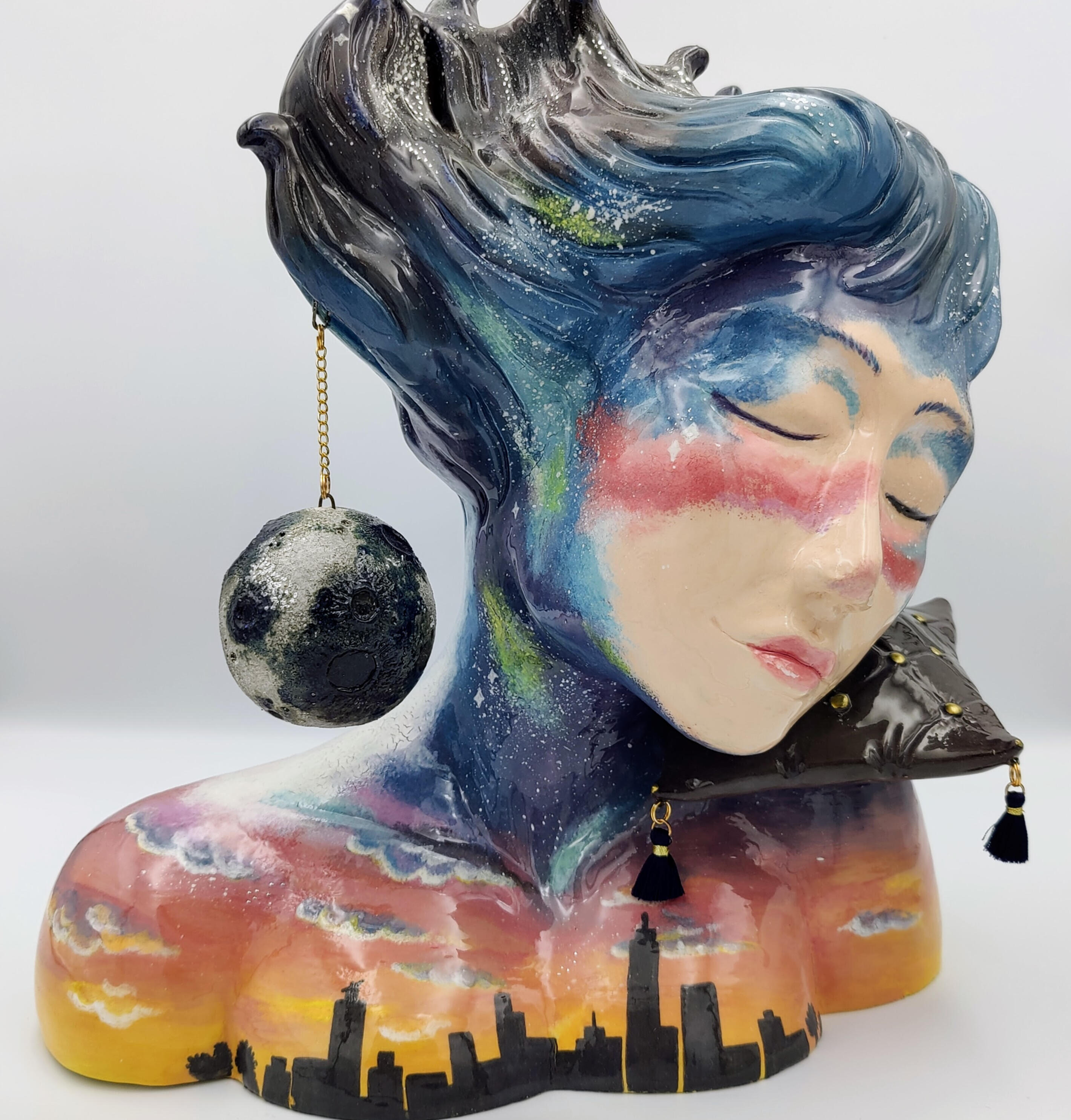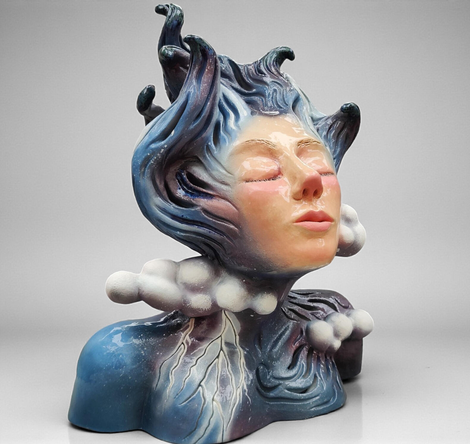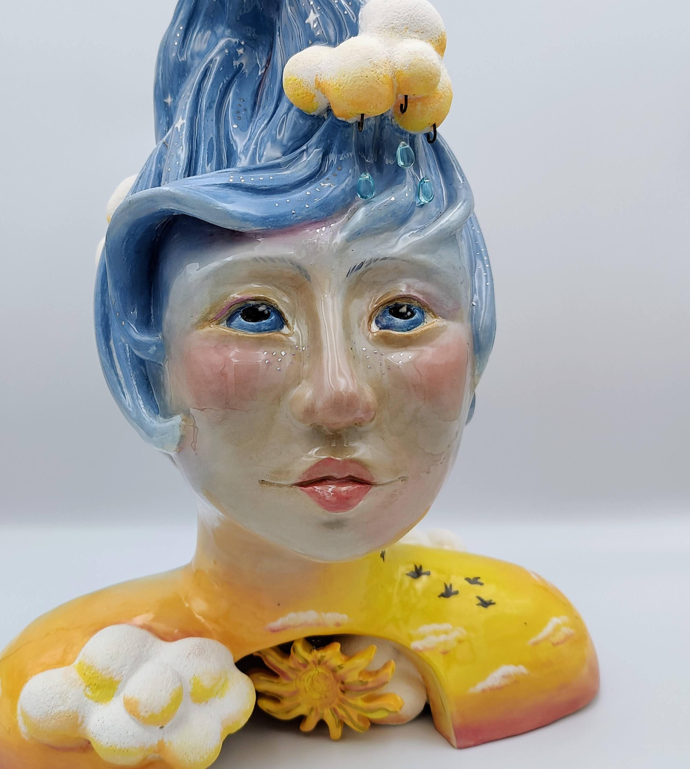 Echoes of Her is a growing collection of handbuilt ceramic busts that explore emotion, transformation, and the layered inner worlds we carry. Each piece reflects a different facet of feeling, captured through flowing forms and richly painted surfaces.These sculptures blend figurative storytelling with natural and emotional symbolism — clouds, lightning, sunsets, stars, and rain become part of each figure’s voice. They are not portraits, but echoes of women shaped by memory, mood, and moments. Each bust is its own small universe: part sculpture, part sentiment, part soul.
